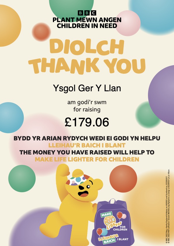 Llwyddwyd i godi £179.06 tuag at elusen Plant Mewn Angen. Diolch o galon i bawb am eich cefnogaeth - mae eich cyfraniadau'n gwneud gwahaniaeth enfawr. Diolch i'r Cyngor Ysgol am drefnu ddiwrnod ffantastig.